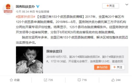 10月17日,国务院扶贫办开通官方微博“国务院扶贫办”,并在微博宣布,经县级提出、市级初审、省级核查和公示等程序,再通过第三方评估机构专项评估检查,2017年全国有20个省区市125个贫困县“脱贫摘帽”。两年来,全国已经有153个县“脱贫摘帽”。